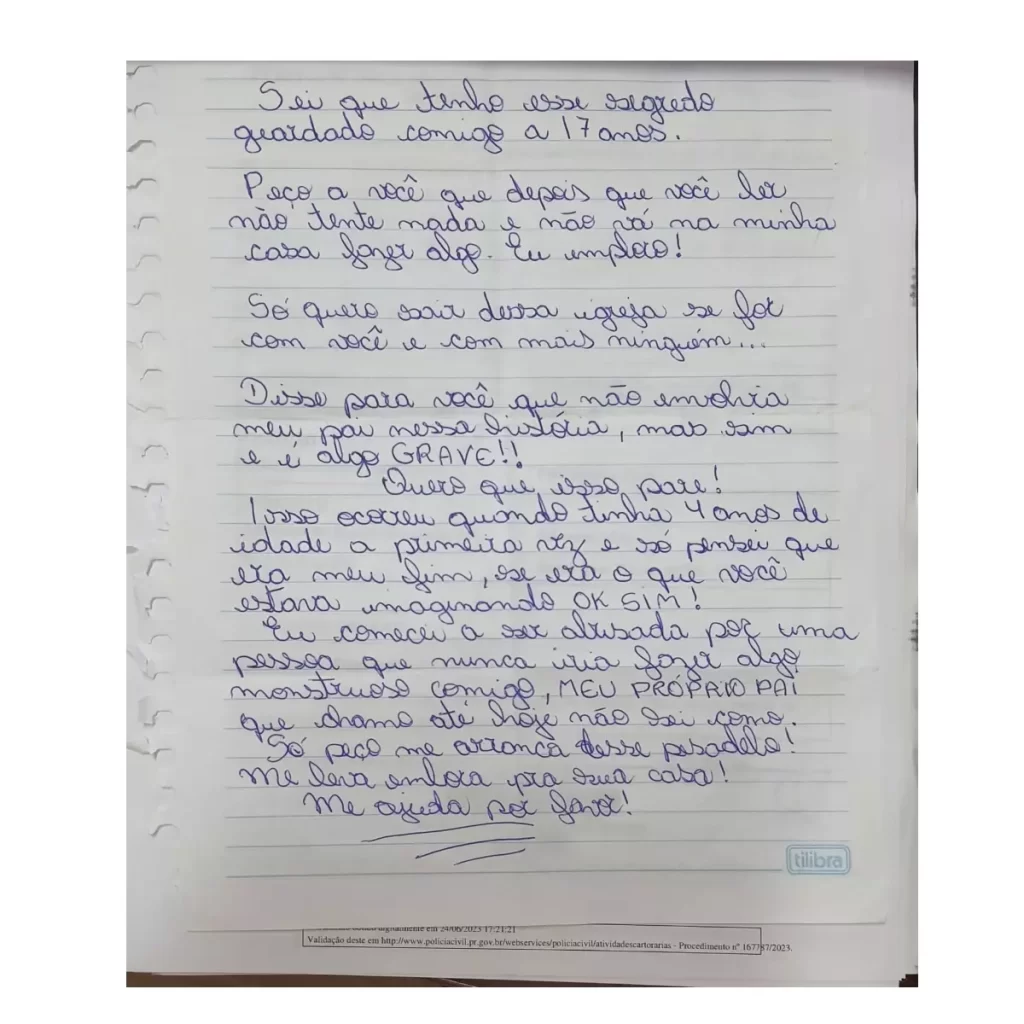 A mulher da igreja levou a carta na delegacia. A filha disse à polícia que ele começou com os abusos quando a mãe delas faleceu. (com tá sabendo)