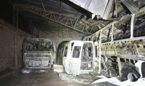 Três veículos foram destruídos em um incêndio de grandes proporções ocorrido no início da madrugada deste domingo, 10, em uma garagem de ônibus, na cidade